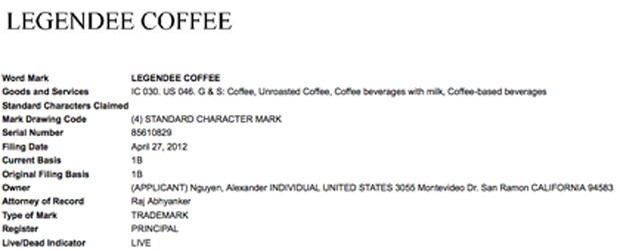 Trên trang chủ legendeecoffee.com ghi rõ: ‘Bản quyền thương hiệu Cà phê Legendee (Legendee Coffee) và tất cả các thiết kế, văn bản, đồ họa, hình ảnh xuất hiện trên website www.legendeecoffee.com là tài sản thuộc sở hữu của ông Alexander Nguyen đã được đăng ký và bảo vệ bởi luật bản quyền Hoa Kỳ.’