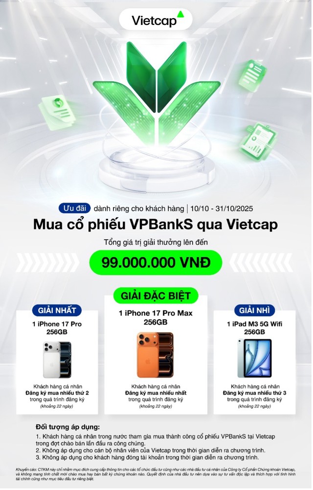 Cụ thể, chương trình khuyến mãi áp dụng cho nhà đầu tư đăng ký tại CTCP Chứng khoán Vietcap để mua cổ phiếu VPBankS trong đợt chào bán lần đầu ra công chúng (IPO) của Công ty Cổ phần Chứng khoán VP Bank (VPBankS).