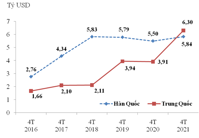 4 tháng đầu năm, Việt Nam có nhiều nhóm hàng nhập khẩu từ Trung Quốc đạt kim ngạch từ 1 tỷ USD trở lên gồm: máy móc thiết bị, dụng cụ, phụ tùng (7,46 tỷ USD); máy vi tính, sản phẩm điện tử và linh kiện (6,3 tỷ USD); điện thoại và linh kiện (2,97 tỷ USD); vải (2,68 tỷ USD)...