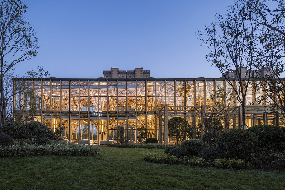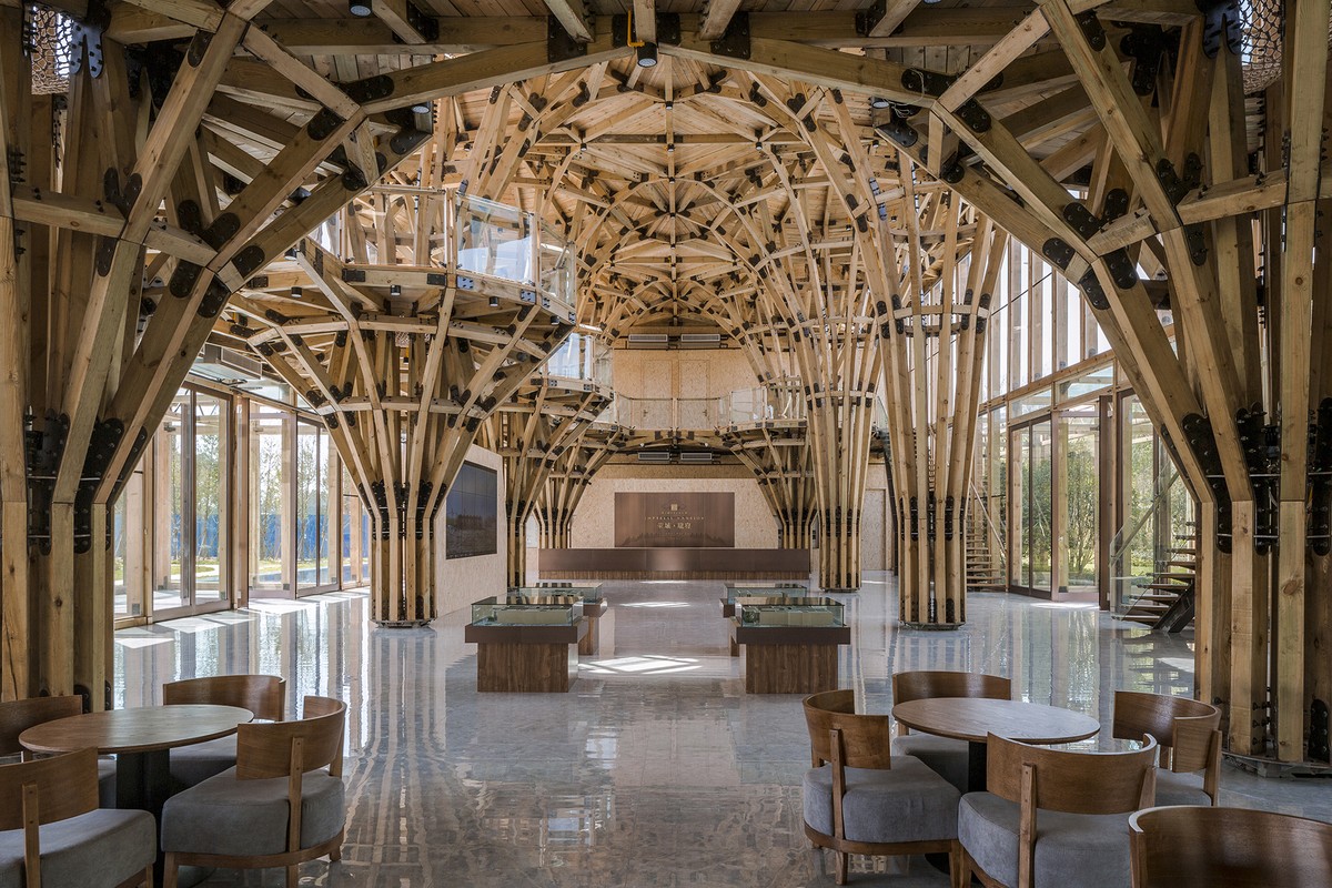 Các khối gỗ lớn, sắc xanh và vật liệu xây dựng tự nhiên được lựa chọn để tạo nên Trung tâm Longfu nhằm phù hợp với thị hiếu cũng như nhu cầu của khách hàng.
