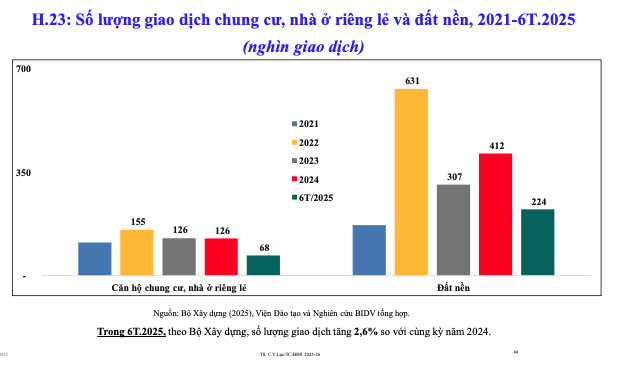Thứ năm, nghĩa vụ tài chính đã qua giai đoạn khó khăn nhất; tiếp cận vốn được duy trì. Về vốn tín dụng, đến ngày 30/6/2025, dư nợ lĩnh vực bất động sản ước đạt 3,18 triệu tỷ đồng (chiếm 18,5% tổng dư nợ nền kinh tế), trong đó tín dụng kinh doanh bất động sản đạt khoảng 1,65 triệu tỷ đồng (chiếm 51,8%; tăng 13% so với cuối năm 2024, so với tăng trưởng tín dụng chung là 10%).