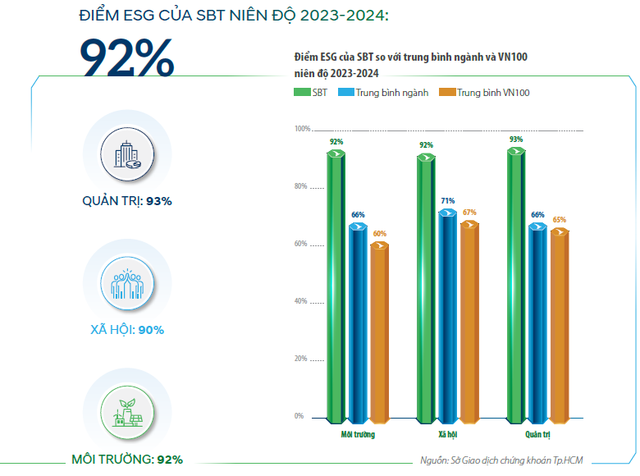 Niên độ vừa qua, cổ phiếu SBT của TTC AgriS cũng tiếp tục năm thứ 7 năm lọt vào rổ Chỉ số phát triển bền vững VNSI (Viet Nam Sustainability Index), rổ chỉ số gồm top 20 cổ phiếu thuộc VN100 có điểm phát triển bền vững tốt nhất thị trường. Trong đó, điểm ESG của cổ phiếu SBT là Môi trường: 92%, Xã hội: 90% và Quản trị: 93%, cao hơn trung bình ngành và trung bình VN100.