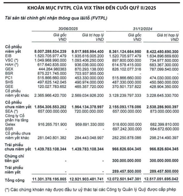Trong FVTPL, VIX tập trung vào cổ phiếu niêm yết, với giá trị mua gốc 8.007,3 tỷ đồng và giá trị đánh giá lại đến cuối quý II đạt 9.517,9 tỷ đồng, chiếm 73,6% giá trị FVTPL. Phần còn lại phân bổ vào cổ phiếu chưa niêm yết (hơn 1.964 tỷ đồng) và trái phiếu chưa niêm yết (1.439,7 tỷ đồng).