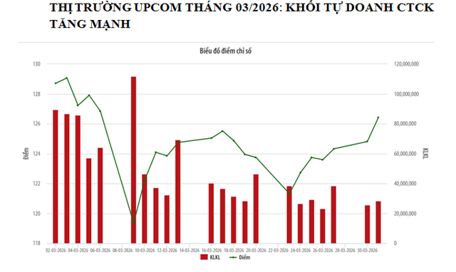 Chỉ số UPCoM-Index sau 2 đợt giảm mạnh đã nhanh chóng phục hồi và đóng cửa phiên giao dịch cuối tháng 3/2026, chỉ số này đứng tại mốc 126,42 điểm, giảm 2,6% so với cuối tháng 02/2026.