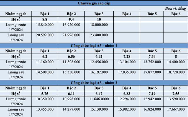 Ở nhóm cán bộ, công chức trong cơ quan nhà nước, mức lương cao nhất là 18,7 triệu đồng mỗi tháng - cao hơn lương hiện tại 4,3 triệu đồng; áp dụng với công chức loại A3, bậc 6 như chuyên viên, thẩm tra viên, kiểm soát viên, kiểm toán viên cao cấp. Mức lương thấp nhất là 3,1 triệu đồng mỗi tháng, áp dụng cho ngạch kế toán viên sơ cấp.