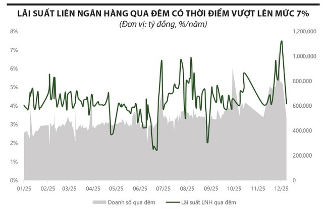 Mặt bằng lãi suất liên ngân hàng gần đây duy trì ở mức cao 5-6%/năm và thậm chí vượt 7%/năm ở một số kỳ hạn. Điều này phản ánh nhu cầu vốn ngắn hạn trong hệ thống ngân hàng tăng mạnh, kéo chi phí vay mượn trên thị trường 2 lên đáng kể. Trước tình hình này, Ngân hàng Nhà nước buộc phải nâng lãi suất OMO từ 4% lên 4,5% sau 19 tháng giữ nguyên, nhằm tái lập mặt bằng chi phí vốn ngắn hạn phù hợp hơn với trạng thái thanh khoản hiện tại.