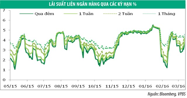 Do NHNN hút ròng, nhu cầu thanh toán của khách hàng gia tăng, đồng thời các ngân hàng cũng phải giữ nguồn cho dự trữ đầu tháng 4, nên lãi suất liên ngân hàng bật tăng trở lại, sau khi giảm mạnh trong những tuần trước đó. Lãi suất các kỳ hạn ngắn dưới 1 tháng tăng 87 - 123 điểm cơ bản, lãi suất các kỳ hạn dài hơn tăng nhẹ. Cuối tuần, lãi suất các kỳ hạn tham khảo như sau: qua đêm (3,8%/năm; +106 điểm), 1 tuần (4,3%/năm; +123 điểm), 2 tuần (4,3%/năm; +87 điểm), 1 tháng (4,6%/năm; +30 điểm).