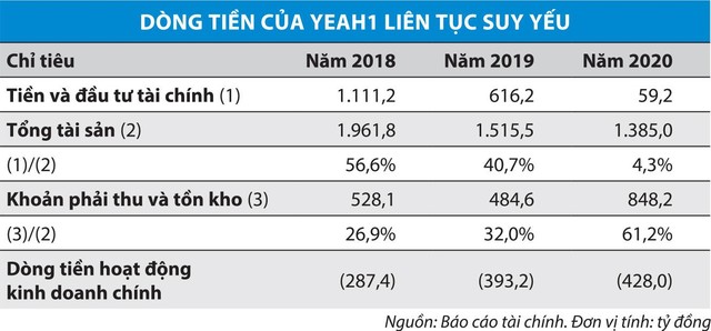 Cùng với việc thua lỗ nặng, các chỉ số tài chính của Công ty cũng xấu đi. Thời điểm lên niêm yết vào cuối năm 2018, Yeah1 có tổng số tiền và đầu tư tài chính ngắn hạn lên tới 1.111,2 tỷ đồng, chiếm 56,6% tổng tài sản.