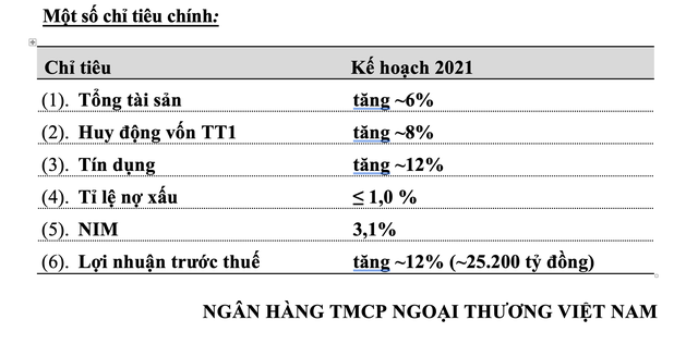 Về định hướng kinh doanh năm 2021, thông tin tại Hội nghị cho biết, phương châm hành động của Vietcombank là “Chuyển đổi, Hiệu quả, Bền vững”, trọng tâm là đổi mới mô hình tăng trưởng theo chiều sâu, chuyển dịch cơ cấu hoạt động, đảm bảo tăng trưởng bền vững, hiệu quả cao và nâng cao năng suất lao động và quan điểm chỉ đạo điều hành “Trách nhiệm - Hành động - Sáng tạo”. Tiếp tục tập trung thực hiện 5 đột phá chiến lược và 3 trọng tâm trong chuyển dịch cơ cấu kinh doanh.