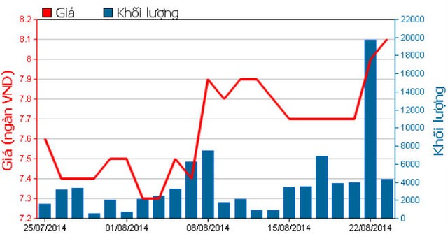 Biểu đồ giá, khối lượng giao dịch của cổ phiếu TYA trong 1 tháng qua. Nguồn: HOSE