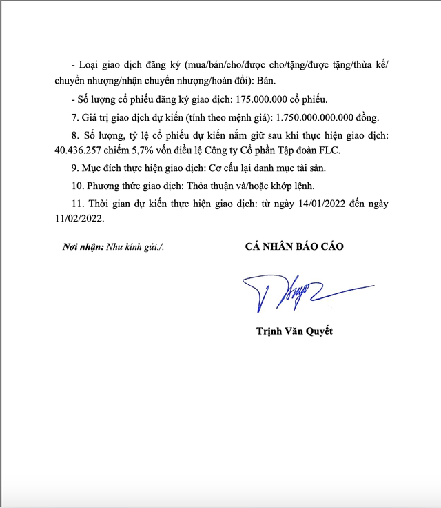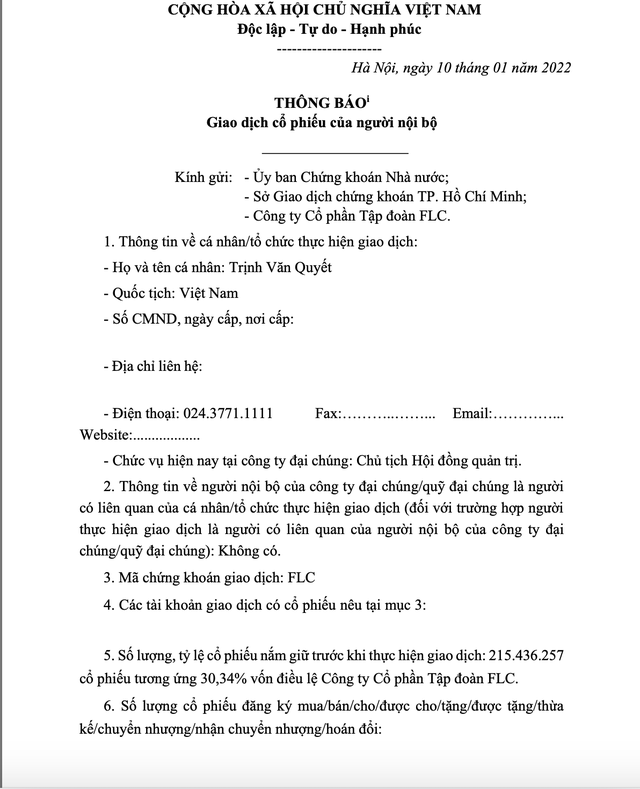 Ngày hôm qua (10/1/2022), Tập đoàn FLC đã có văn bản mới thay cho văn bản kể trên - báo cáo lên UBCKNN, HOSE về giao dịch nội bộ của Chủ tịch Tập đoàn FLC Trịnh Văn Quyết. Toàn bộ nội dung không thay đổi, chỉ thay đổi ngày đăng ký bán dời lên ngày 14/1-11/2022.