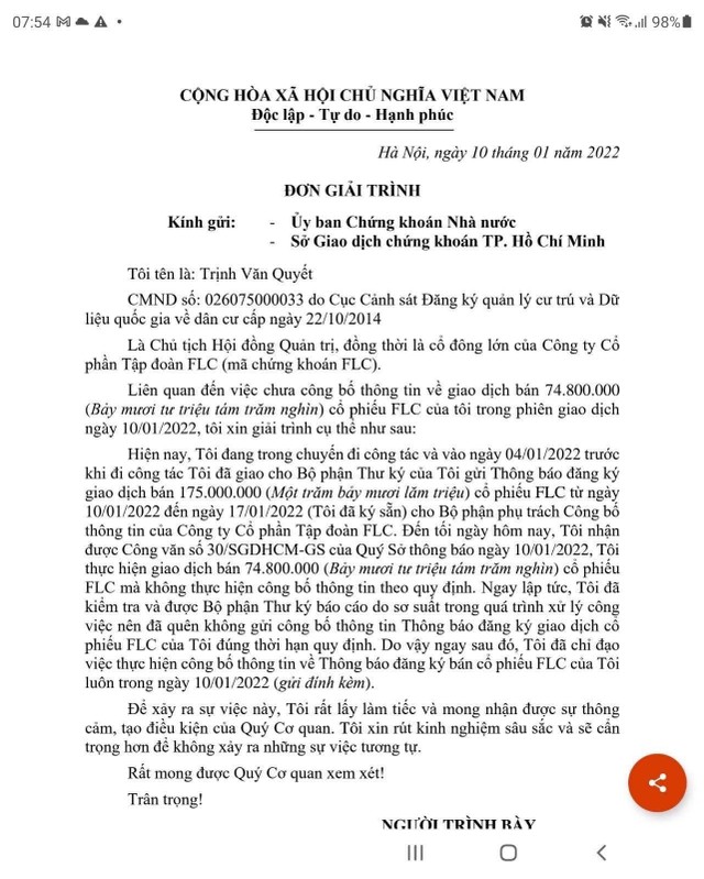 Thêm vào đó, trên các room chat, diễn đàn lan truyền văn bản Đơn giải trình của ông Quyết - chưa được xác thực về Đơn giải trình của ông Quyết - nói chưa xác thực là bởi văn bản này không thấy đăng tải trên website FLC, website của HOSE cũng không xuất hiện - với nội dung cũng khiến nhà đầu tư bức xúc thêm.
