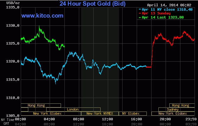 Giá vàng giao ngay tăng 0,8% lên 1.328,88 USD/ounce vào đầu giờ giao dịch ngày hôm nay trên sàn Singapore, mức cao nhất kể từ 24/3. Đến 5h chiều, giá giảm nhẹ còn 1.323,8 USD/ounce. Kim loại quý đã có tuần thứ hai liên tiếp tăng giá trong tuần qua khi chỉ số S&P 500 có tuần giảm mạnh nhất kể từ 2012.