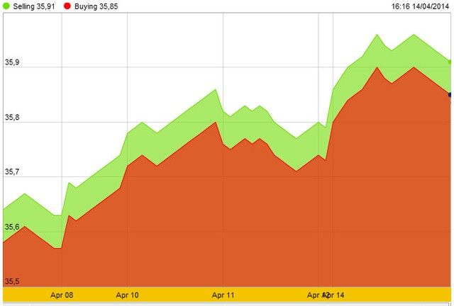 Tại thị trường trong nước, giá vàng SJC cũng tăng nửa đầu ngày hôm nay, lên mức cao nhất trong ngày là 35,90 - 35,96 triệu đồng/lượng. Đây cũng là mức cao nhất kể từ ngày 24/3. Đến 5h chiều, giá vàng thương hiệu quốc gia giảm còn 35,85 - 35,91 triệu đồng/lượng, tăng 50.000 đồng/lượng so với cuối tuần trước.
