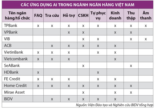 Ngoài ra, các tổ chức tín dụng bắt đầu sử dụng AI trong nhiều hoạt động như giao dịch ngoại tệ, tín dụng cá nhân, ngân hàng số (VPBank, ACB…), công nghệ AI Voice cho phép người dùng chuyển đổi giọng nói thành văn bản và ngược lại (VIB, VietinBank…), lọc tệp khách hàng mục tiêu cho các gói sản phẩm phù hợp (VietinBank, BIDV…).