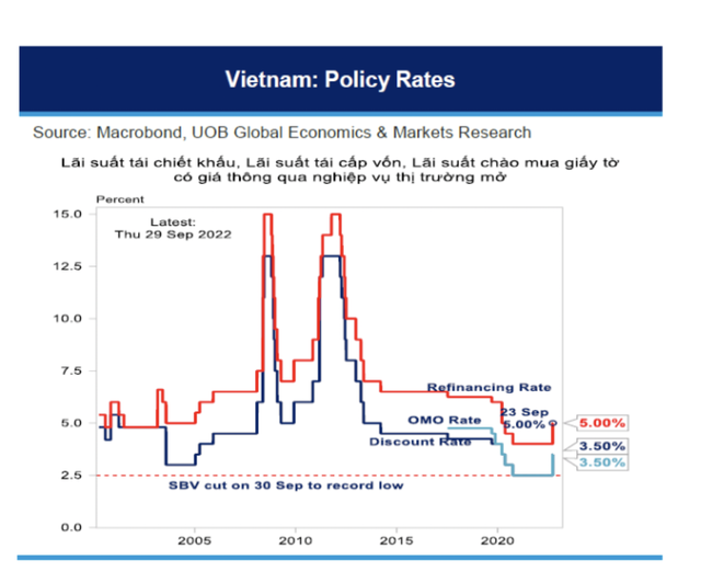 Về chính sách tiền tệ, UOB cho rằng, Ngân hàng Nhà nước Việt Nam (NHNN) gây bất ngờ với việc thắt chặt lãi suất vào cuối giờ chiều 22/9, qua đó báo hiệu bắt đầu chu kỳ bình thường hóa chính sách sau khi Fed tăng lãi suất cơ bản thêm 75 điểm cơ bản lần thứ ba liên tiếp vào sáng cùng ngày. NHNN đã tăng hai lãi suất chính sách lên 100 điểm cơ bản, nâng lãi suất tái cấp vốn từ mức thấp lịch sử 4,00% lên 5,00%.