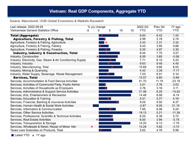 Sự phục hồi mạnh mẽ của GDP trong quý III/2022, theo UOB được hỗ trợ bởi mức tăng trưởng âm vào cùng kỳ năm ngoái với mức giảm kỷ lục 6% khi Việt Nam phải đóng cửa do biến thể Omicron của virus COVID-19. Trong khi đó, việc mở cửa trở lại và nới lỏng các hạn chế di chuyển kể từ đầu năm nay đã giúp thúc đẩy hoạt động kinh doanh từ quý II/2022, đặc biệt là trong lĩnh vực dịch vụ khi tâm lý chung được cải thiện.