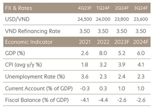 Trước tình hình kinh tế còn nhiều khó khăn, Ngân hàng Nhà nước Việt Nam (NHNN) đã phản ứng nhanh chóng bằng cách cắt giảm lãi suất tái cấp vốn tích lũy 150 điểm cơ bản vào tháng 6 năm 2023, xuống còn 4,50%. Mặc dù vậy, UOB vẫn thấy triển vọng cắt giảm lãi suất thêm 100 điểm cơ bản nữa (xuống 3,50%), nhưng thời gian đã được chuyển sang quý IV/2023 để cân bằng giữa tăng trưởng và áp lực lạm phát.
