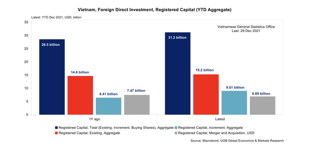 Đầu tư trực tiếp nước ngoài (FDI) được đẩy mạnh khi các nhà đầu tư nước ngoài tiếp tục đánh giá cao tiềm năng dài hạn của Việt Nam ngoài các diễn biến ngắn hạn trong đại dịch. Vốn FDI đăng ký cộng dồn tăng 9,5% lên 31,2 tỷ USD vào năm 2021, so với 28,5 tỷ USD vào năm 2020, được thúc đẩy bởi cả dòng vốn đầu tư vào các dự án hiện hữu và dòng vốn đầu tư gia tăng mới.