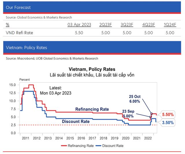 Bao gồm cả việc cắt giảm 50 điểm cơ bản mới được thông báo gần đây, UOB tiếp tục cho rằng NHNN có thể giảm tổng cộng 100 điểm cơ bản trong quý II/2023. Điều này có nghĩa là lãi suất tái cấp vốn rất có thể sẽ giảm thêm 50 điểm cơ bản trước thời điểm cuối tháng 6 để hỗ trợ cho các hoạt động kinh tế trong nước.