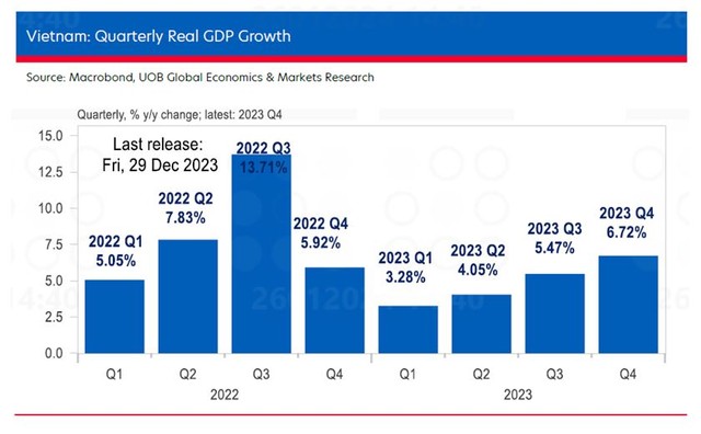 Theo Báo cáo, dữ liệu do Tổng cục Thống kê (GSO) công bố vào cuối năm ngoái (29/12/2023) cho thấy tốc độ tăng trưởng GDP thực tế của Việt Nam đã tăng lên 6,72% so với cùng kỳ trong quý IV/2023, kéo dài đà tăng trong quý III/2023 (5,33% so với cùng kỳ) và quý II/2023 (4,14% so với cùng kỳ). Kết quả vượt xa cuộc thăm dò của Bloomberg là 6,00% và thấp hơn một chút so với dự đoán của UOB là 7,00%, đây là một tín hiệu lạc quan trong một năm đầy thử thách.