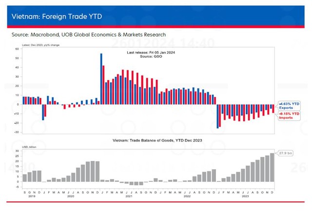 Động lực chính trong quý IV/2023 được UOB ghi nhận là sự đảo chiều của cả hoạt động xuất khẩu và nhập khẩu từ mức giảm so cùng kỳ bắt đầu từ gần một năm trước (kể từ tháng 11/2022) khi lập trường chính sách thắt chặt của các ngân hàng trung ương trên toàn thế giới và sự suy thoái trong nhu cầu ngành bán dẫn xảy ra đã tác động đến nhu cầu bên ngoài tại Việt Nam và các nơi khác.