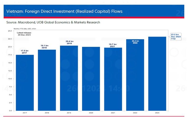 Đáng chú ý, bất chấp một năm khó khăn đối với cả các nhà xuất khẩu và nhà sản xuất trong bối cảnh bất ổn toàn cầu và căng thẳng địa chính trị, dòng vốn đầu tư trực tiếp nước ngoài (FDI) đã thực hiện (hoặc giải ngân) vào Việt Nam đạt mức cao kỷ lục 23,2 tỷ USD vào năm 2023, vượt qua kỷ lục trước đó là 22,4 tỷ USD vào năm 2022. Trong khi đó, dòng vốn FDI đăng ký vào năm 2023 đã tăng 32% lên 36,6 tỷ USD từ 27,7 tỷ USD vào năm 2022, gần bằng mức cao kỷ lục 38 tỷ USD vào năm 2019.