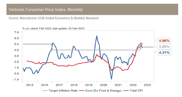 Chuyên gia UOB cho biết: "Chúng tôi giữ nguyên dự báo tăng trưởng GDP năm 2023 ở mức 6,6%, khá sát với mức dự báo tăng 6,5% từ Chính phủ Việt Nam. Điều này có tính đến dự báo tăng trưởng trong quý I/2023 ở mức 6,45% so với cùng kỳ, phần lớn là do cơ sở tính toán thấp trong năm 2022. Báo cáo GDP quý I/2023 của Việt Nam sẽ được công bố vào ngày 29/3 tới".