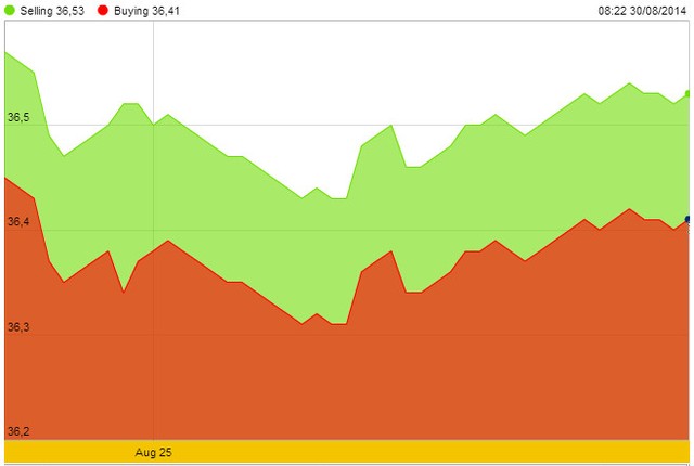 Trên thị trường quốc tế, cặp EUR/USD chỉ giảm khá mạnh trong ngày đầu tuần, sau đó chuyển sang xu hướng đi ngang. Tính đến cuối ngày 29/8, theo giờ Việt Nam, cặp tỷ giá này ở mức 1,3187, giảm so với mức 1,3238 cuối tuần trước đó. Cặp USD/JPY thì tăng đầu tuần trước khi đi ngang, cùng giờ trên ở mức 103,96, gần bằng mức cuối tuần trước đó.