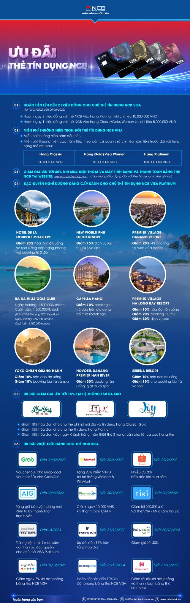 Năm 2022 được xem là năm phục hồi của ngành du lịch với loạt ưu đãi kích cầu từ nhiều khách sạn, khu nghỉ dưỡng. Với thẻ tín dụng NCB Visa hạng Platinum, từ nay đến ngày 31/12/2022, chủ thẻ đặt phòng, nghỉ dưỡng và sử dụng dịch vụ tại hệ thống nghỉ dưỡng đẳng cấp thuộc Sun Hospitality sẽ hưởng ưu đãi tới 30%: Hotel De La Couple Mgallery, New World Phú Quốc Resort, Premier Village Đà Nẵng Resort, Bà Nà Hill Golf Club, Capella Hà Nội, Premier Village Hạ Long Bay Resort, Yoko Onsen Quang Hanh, Novotel Đà Nẵng Premier Han River, Serena Resort.