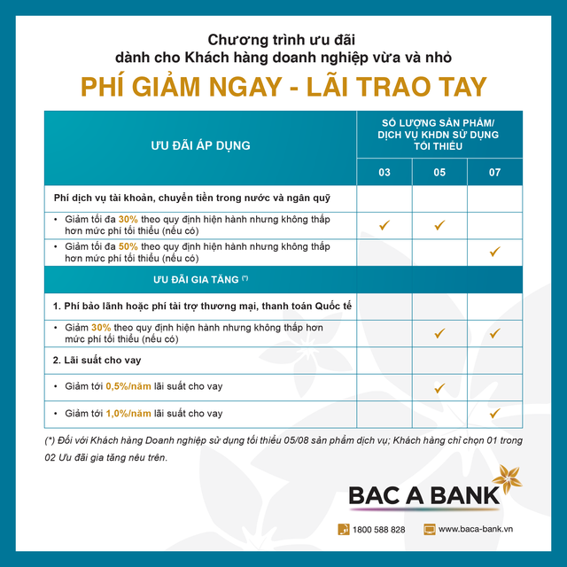 Combo “siêu hấp dẫn” vừa giảm tối đa tới 50% phí dịch vụ vừa giảm lãi suất cho vay lên đến 1%/năm. Các gói ưu đãi được thiết kế phù hợp với điều kiện và mức độ ưu tiên sử dụng các sản phẩm, dịch vụ của BAC A BANK như: Cho vay ngắn hạn; Phát hành bảo lãnh; Phát hành cam kết thu xếp vốn; Thanh toán quốc tế (Bao gồm LC/TTR/…); Mua bán ngoại tệ; Thương lượng thanh toán/ Chiết khấu bộ chứng từ; Dịch vụ chi trả lương/ Internet banking và Sử dụng tài khoản thanh toán/ Tiền gửi tại BAC A BANK.