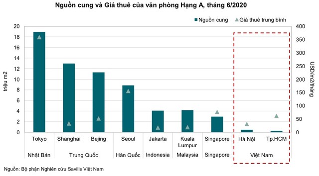 Tuy nhiên, theo số liệu khảo sát, tính đến tháng 6/2020, nguồn cung văn phòng hạng A ở hai thành phố lớn là TP.HCM và Hà Nội chỉ hơn 730.000m2, chỉ bằng 23% nguồn cung tại Singapore và 19% của Kuala Lumpur (Malaysia). Vì vậy, nguồn cung này vẫn rất khan hiếm ở cả TP.HCM và thủ đô Hà Nội. Do đó, tỷ lệ lấp đầy vẫn cao mặc dù thị trường chịu ảnh hưởng từ dịch Covid-19.