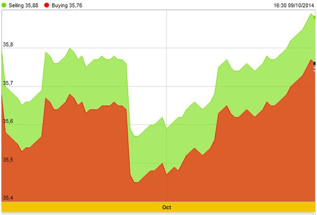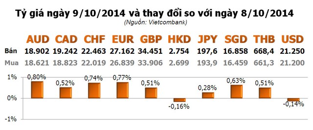 Các ngoại tệ khác, hầu hết tăng. Trong đó, tăng mạnh nhất là AUD với 0,80%; tiếp theo là EUR với 0,77%; CHF với 0,74%...