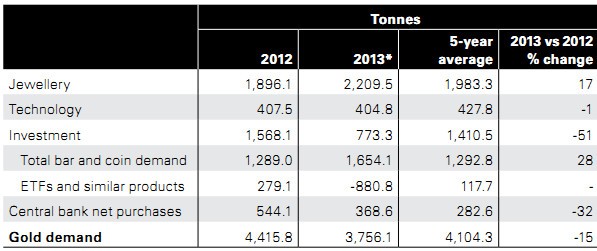 Theo WGC, tổng nhu cầu vàng toàn cầu đã giảm xuống trong năm 2013 khi nhà đầu tư rút khỏi các quỹ chỉ số nhiều hơn lượng mua tăng lên đối với vàng vật chất. WGC cũng cho biết, nhu cầu vàng trang sức đã tăng trở lại mức trước khủng hoảng tài chính, trong khi đầu tư vàng miếng loại nhỏ và vàng tiền lên mức cao kỷ lục.