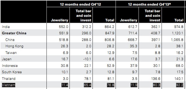 Trong cả năm 2013, lượng mua vàng, bao gồm vàng trang sức, vàng miếng nhỏ và vàng tiền (WGC gọi là cầu tiêu dùng) đã tăng 21% lên mức cao kỷ lục là 3.863,5 tấn.