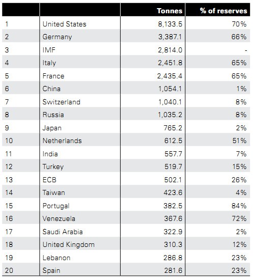 Trong danh sách của WGC, Mỹ hiện dẫn đầu với 8.133,5 tấn; tiếp theo là Đức với 3.387,1 tấn, Quỹ Tiền tệ Quốc tế (IMF), 2.814 tấn; Italia, 2.451,8 tấn; Pháp, 2.435,4 tấn; Trung Quốc 1.054,1 tấn (nhiều nhà phân tích nghĩ rằng, nước này vẫn lặng lẽ tăng dự trữ vàng trong những năm gần đây, nhưng không công bố); Thụy Sỹ, 1.040,1 tấn; Nga, 1.035,2 tấn.