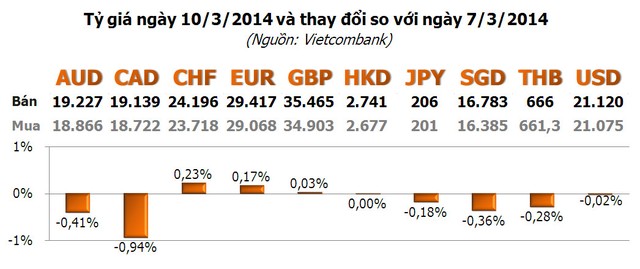 Các ngoại tệ khác bất ngờ chuyển sang chiều giảm, với CAD giảm mạnh nhất là -0,94%; tiếp theo là AUD với -0,41%; SGD với -0,36%... Số ít các ngoại tệ tăng thì tăng không đáng kể.