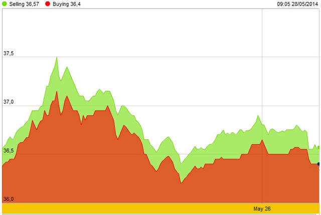 Cuộc khủng hoảng địa chính trị Nga – Ukraine có dấu hiệu lắng dịu, ít nhất là một nấc, sau kỳ nghỉ cuối tuần. Ukraine đã tổ chức cuộc bầu cử tổng thống hôm Chủ nhật. Tổng thống mới đắc cử, Petro Poroshenko, nói ông muốn làm việc với Nga và châu Âu để hòa nhập đất nước ông với cả hai. Phát biểu gần đây từ Tổng thống Nga Vladimir Putin cũng có vẻ mang tính hòa giải hơn. Các tin tức mới này cho phép khẩu vị rủi ro trở lại với các thị trường hôm thứ Ba. Tuy nhiên, các báo cũng nói rằng, vẫn có cuộc đụng độ nghiêm trọng xảy ra giữa quân đội chính phủ Ukraine và các phần tử ly khai ủng hộ Nga.