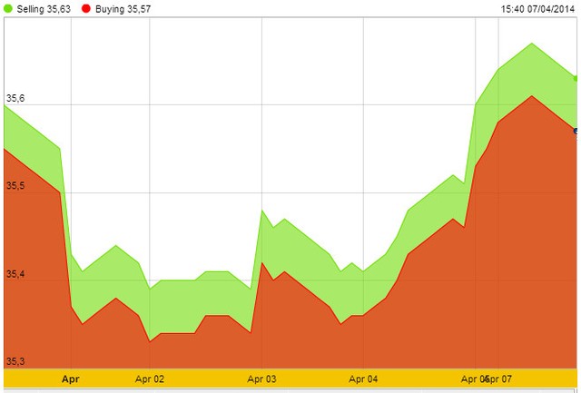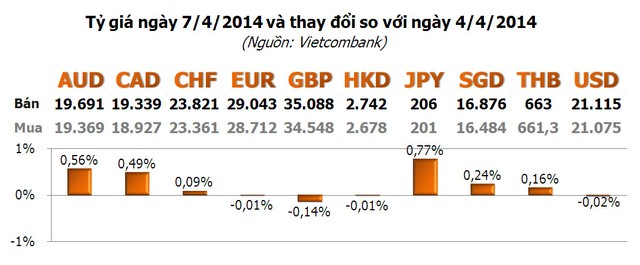 Sáng nay, Vietcombank bất ngờ niêm yết giá bán ra USD ở mức 21.130 đồng/USD, tăng 10 đồng/USD so với cuối tuần trước và là mức cao nhất trong vòng 3 tuần. Tuy nhiên, sau đó, Ngân hàng đã điều chỉnh lại cả giá mua và giá bán xuống còn tương ứng 21.075 - 21.115 đồng/USD, bằng với ngày 3/4, mức thấp nhất trong vòng 10 tuần.