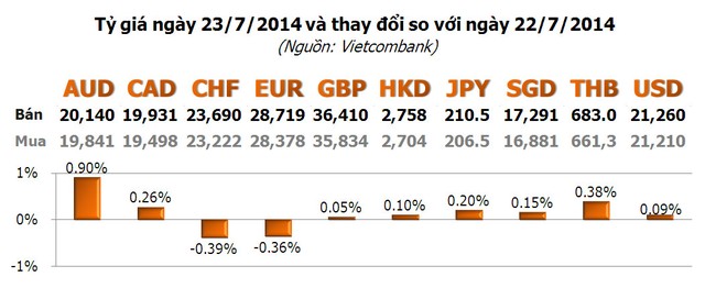 Với các ngoại tệ khác, chỉ có CHF và EUR giảm, lần lượt 0,39% và 0,36%, còn lại tăng. Trong đó, AUD tăng mạnh nhất với 0,9%; tiếp theo là THB với 0,38%...