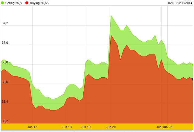 Tại thị trường trong nước, giá vàng SJC giảm nhẹ trong ngày hôm nay, đến 4h chiều còn 36,65 - 36,80 triệu đồng/lượng, giảm 100.000 đồng/lượng so với cuối tuần trước.
