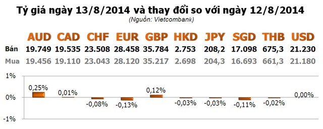 Các ngoại tệ khác cũng hầu hết không thay đổi so với hôm qua. Trong đó, tăng mạnh nhất là AUD với 0,25%. Còn lại đều tăng/giảm từ 0,12% trở xuống.
