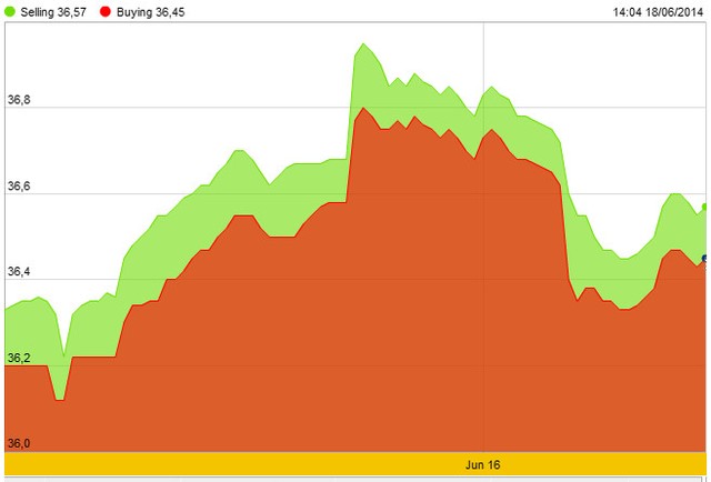 Tại thị trường trong nước, giá vàng SJC sau khi giảm mạnh hôm qua, xuống mức thấp nhất trong ngày là 36,33 - 36,45 triệu đồng/lượng, đã tăng trở lại, đà tăng tiếp diễn trong ngày hôm nay (18/6) và đạt mức 36,47 - 36,60 lúc 8h sáng. Đến 2h30 chiều, giá vàng thương hiệu quốc gia ở mức 36,45 - 36,57 triệu đồng/lượng.