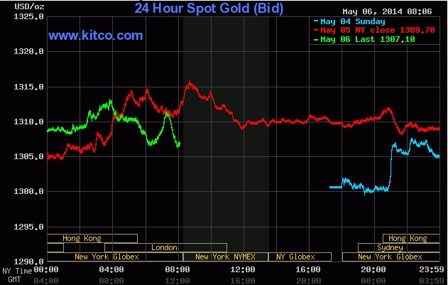 Giá vàng giao ngay thay đổi nhẹ ở mức 1.310,73 USD/ounce lúc 9h37 trên sàn London. Giá vàng giao tháng 6 tăng 0,1% lên 1.310,8 USD/ounce trên sàn Comex.
