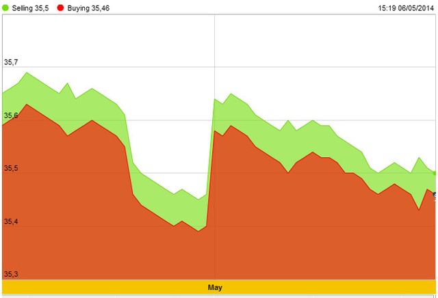 Tại thị trường trong nước, trở lại sau kỳ nghỉ lễ dài, giá vàng SJC hôm thứ Hai đã tăng mạnh so với ngày 29/4, từ 35,40 - 35,46 triệu đồng/lượng lên 35,58 - 35,64 triệu đồng/lượng. Tuy nhiên, từ đây, giá liên tục trong xu hướng giảm cho đến 3h30 chiều qua, còn 35,46 - 35,50 triệu đồng/lượng.