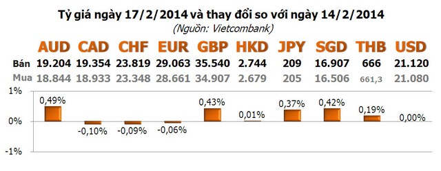 Với các ngoại tệ khác, một số quay đầu giảm nhưng mức giảm không đáng kể như CAD, CHF và EUR. Số còn lại vẫn duy trì đà tăng, trong đó, AUD tăng mạnh nhất với 0,49%; tiếp theo là GBP với 0,43%; SGD với 0,42%; JPY với 0,37%...
