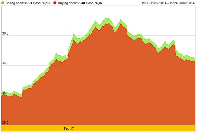 Trên thị trường quốc tế, cặp EUR/USD bắt đầu ngừng đà tăng liên tục 5 ngày khi chạm mức cao 1,3772 trong ngày 19/2, đến 4h chiều qua còn 1,3700. Đồng USD mạnh lên so với nhiều đồng tiền khác song lại giảm so với JPY. Theo đó, cặp USD/JPY trong hai ngày qua đã giảm từ mức 102,73 của ngày 19/2 xuống còn 101,75 vào lúc 4h chiều 20/2.