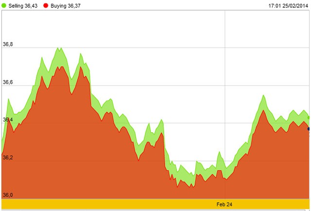 Hai ngày đầu tuần, giá USD tự do liên tục giảm với 5 đồng mỗi ngày trên giá mua, 10 đồng mỗi ngày ở giá bán, còn 21.120 - 21.140 đồng/USD. Trên thị trường ngân hàng, Vietcombank giữ nguyên giá USD niêm yết trong ngày 24/2 ở mức 21.085 - 21.125 USD/ounce trước khi điều chỉnh giảm 5 đồng/USD xuống còn 21.080 - 21.120 đồng/USD trong ngày hôm qua, 25/2.