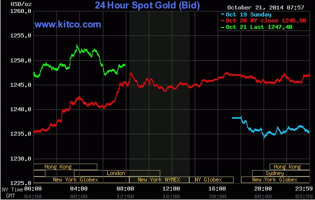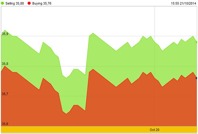 Chỉ số Bloomberg Dollar Spot Index giảm ngày thứ hai liên tiếp, đạt mức thấp nhất trong vòng gần 1 tuần. Các nhà giao dịch tương lai đặt cược vào khả năng Fed tăng lãi suất vào tháng 10/2015 là 45%, giảm so với mức 50% cuối tuần trước. Lượng nắm giữ của các quỹ chỉ số vàng giảm xuống mức thấp trong vòng 5 năm vào hôm 20/10.