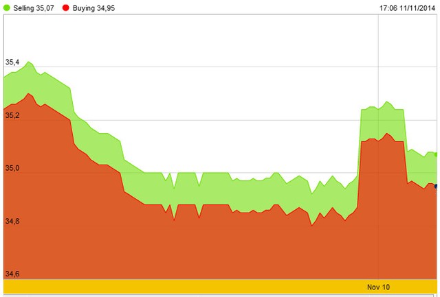 Hôm nay, giá USD trên thị trường tự do tăng thêm 10 đồng lên 21.370 - 21.390 đồng/USD, cao nhất kể từ ngày 27/7/2013. Giá USD do Vietcombank niêm yết không đổi với 21.270 - 21.320 đồng/USD.